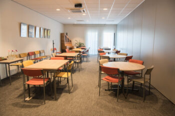 Een zaal die uitermate geschikt is voor vergaderingen. De tafels kunnen in verschillende opstellingen gebruikt worden.
